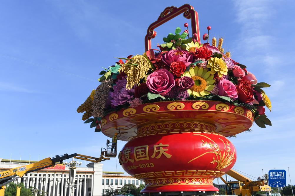 9月22日,施工人員在裝飾天安門廣場上的“祝福祖國”巨型花籃。