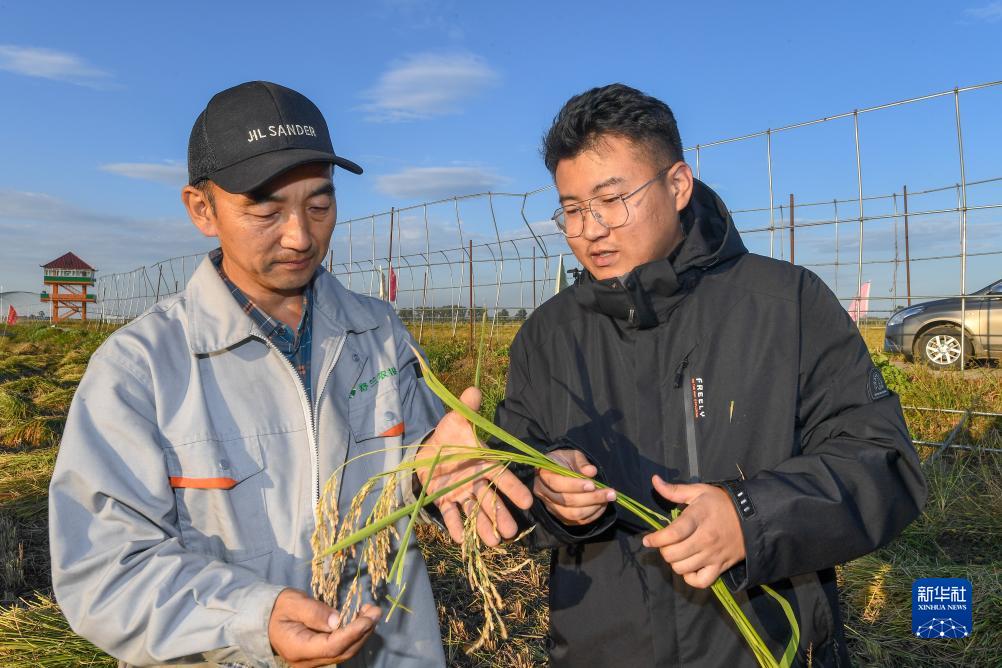 9月21日,在吉林省舒蘭市平安鎮金星村,技術指導員楊佳剛(右)查看水稻收割情況,指導當地家庭農場負責人李學明進行秋收工作。