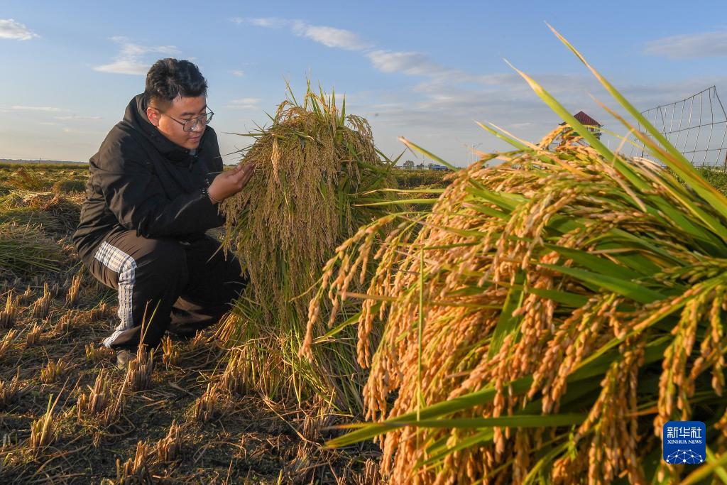 9月21日,在吉林省舒蘭市平安鎮金星村,技術指導員楊佳剛查看水稻收割情況。