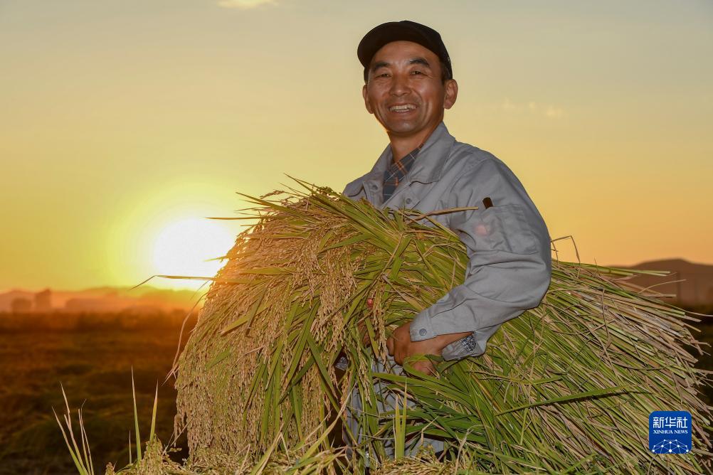 9月21日,在吉林省舒蘭市平安鎮金星村,學明水稻種植家庭農場負責人李學明手捧一捆收穫的水稻。