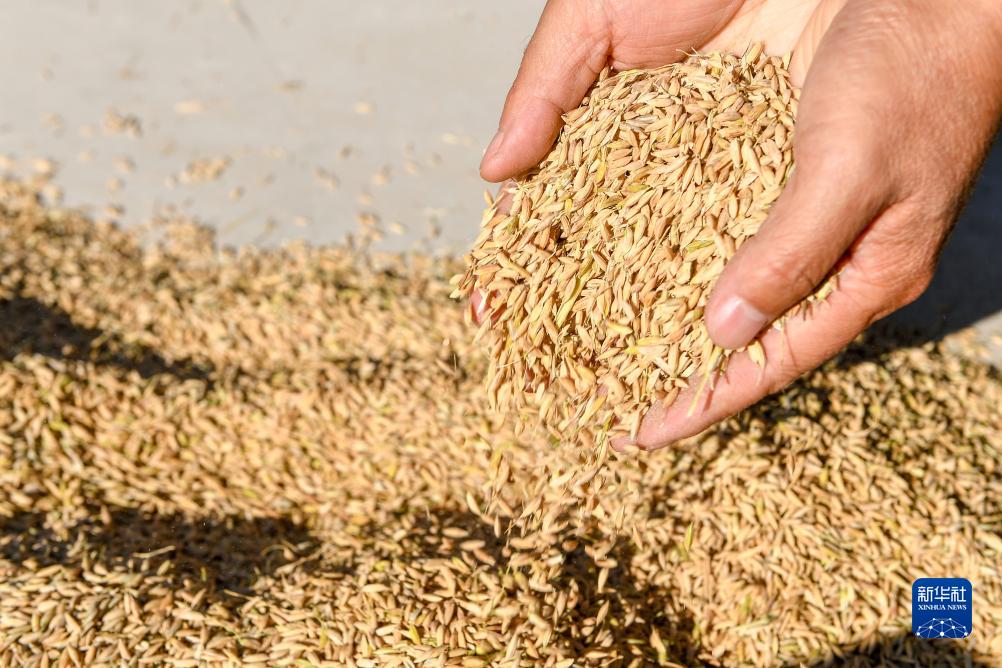 9月22日,在吉林省長春市九台區龍嘉農樂種植家庭農場,負責人李松在手捧收穫的稻穀。