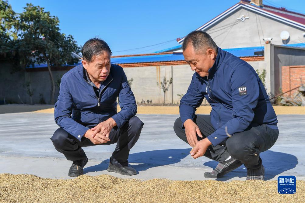 9月22日,在吉林省長春市九台區龍嘉農樂種植家庭農場,農藝師王成忠(左)向農場負責人李松在詢問秋收情況。