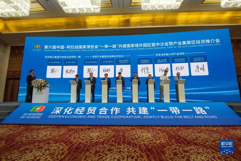 這是9月22日在銀川拍攝的第六屆中阿博覽會“一帶一路”共建國家境外園區暨中沙吉讚産業集聚區投資推介會簽約儀式現場。