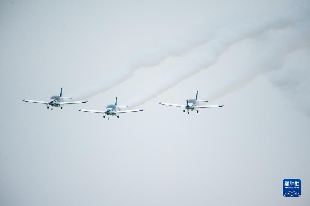 9月22日,在湖南株洲蘆淞機場,飛行員進行固定翼編隊飛行表演。