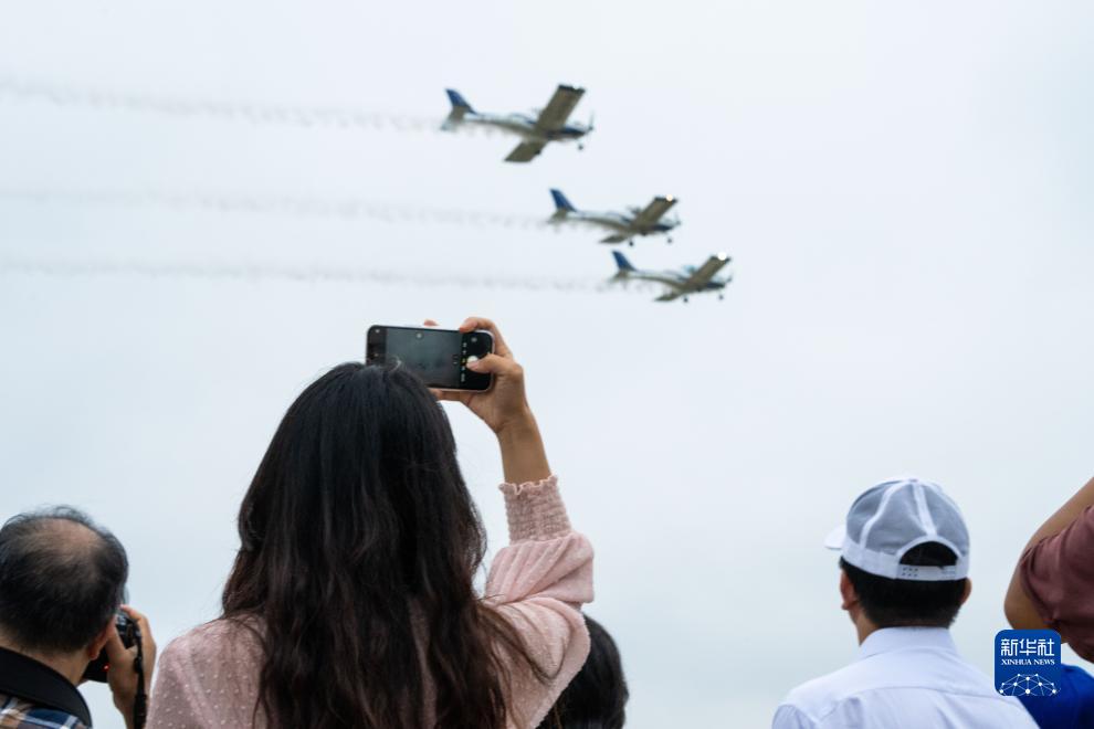 9月22日,在湖南株洲蘆淞機場,觀眾在拍攝固定翼編隊飛行表演。