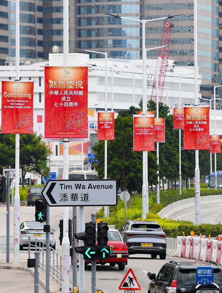 國慶節將至,香港街頭張貼國慶海報,慶祝中華人民共和國成立74周年。