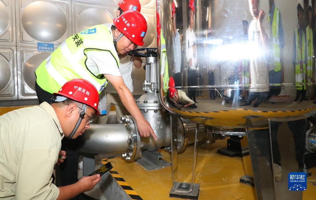 9月22日,中建二局安裝公司技術人員(左二)在施工現場向觀摩團成員介紹水泵房設備的安裝特點。