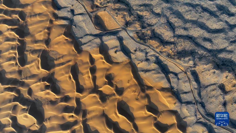 位於中衛市沙坡頭騰格裏沙漠邊緣的治沙林帶與沙漠交匯處(9月6日攝,無人機照片)。