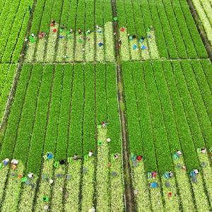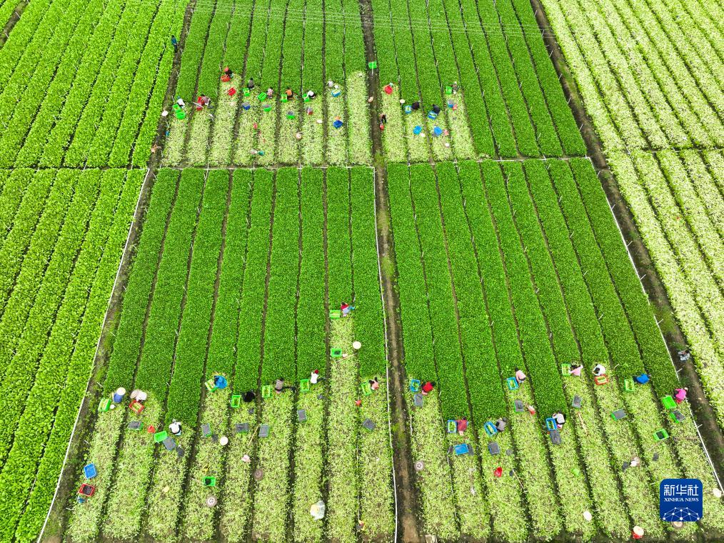 9月23日,在湖南省常寧市勝橋鎮合泉村蔬菜種植基地,村民在采收蔬菜(無人機照片)。