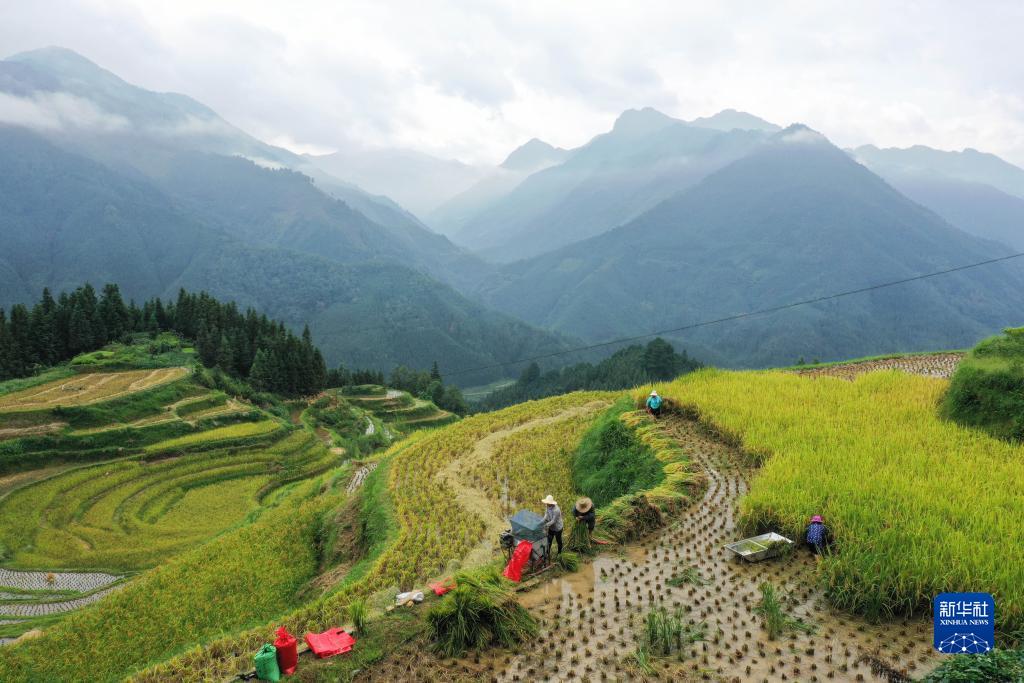 9月23日,村民在貴州省黔東南苗族侗族自治州從江縣剛邊壯族鄉宰別村收割水稻(無人機照片)。