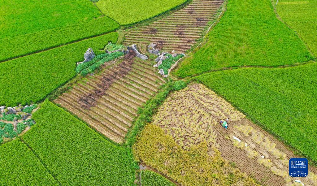 9月23日,湖南省永州市新田縣石羊鎮景仙寺村,村民在田間搶收水稻(無人機照片)。