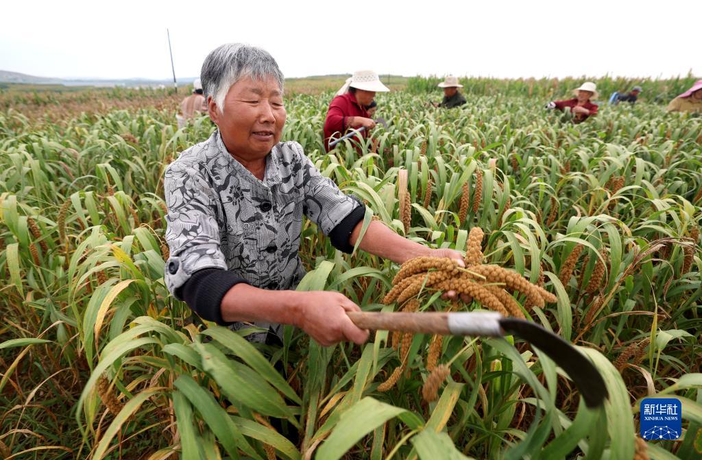 9月23日,農戶在河北省石家莊市行唐縣北河鄉朱家莊村穀子種植基地收穫穀子。