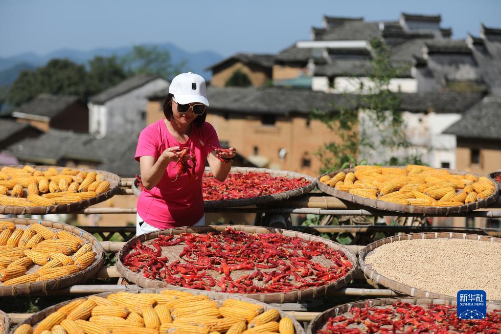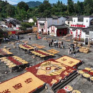 金秋時節,在安徽省黃山市徽州區呈坎村及黃山市歙縣深渡鎮陽産村,“曬秋”成為秋天裏一道靚麗的風景。“曬秋”是皖南地區的傳統習俗,由於氣候潮濕,當地村民利用晴好天氣,將收穫的農作物集中晾曬。五顏六色的農作物被拼成精美的圖案,慶祝豐收的同時,也成為當地特色景觀,吸引不少游客前來觀賞。