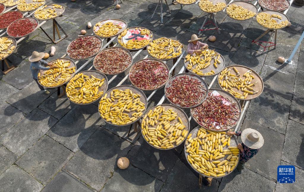 金秋時節,在安徽省黃山市徽州區呈坎村及黃山市歙縣深渡鎮陽産村,“曬秋”成為秋天裏一道靚麗的風景。“曬秋”是皖南地區的傳統習俗,由於氣候潮濕,當地村民利用晴好天氣,將收穫的農作物集中晾曬。五顏六色的農作物被拼成精美的圖案,慶祝豐收的同時,也成為當地特色景觀,吸引不少游客前來觀賞。