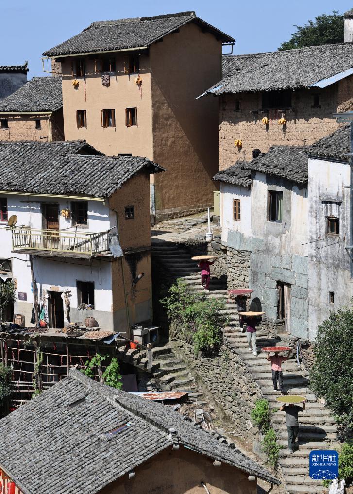 9月18日,在黃山市歙縣陽産村,村民頭頂曬匾走在村裏,準備晾曬農作物。