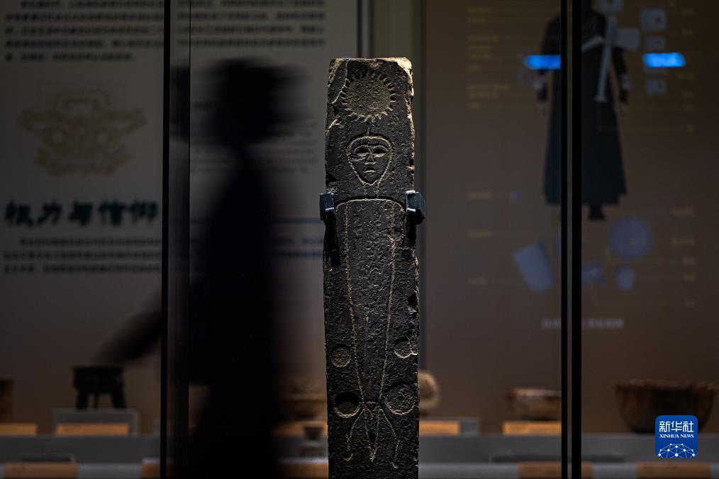 9月23日,參觀者在湖北省博物館長江文明特展上觀看展出的太陽人石刻。