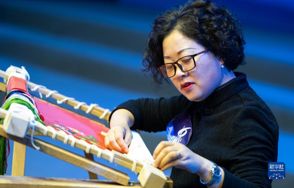9月21日,選手陳紅平在現場展示利川刺繡技藝。