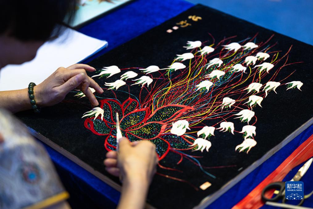 9月21日,選手劉榮萍在現場展示民間美術麥稈畫技藝。