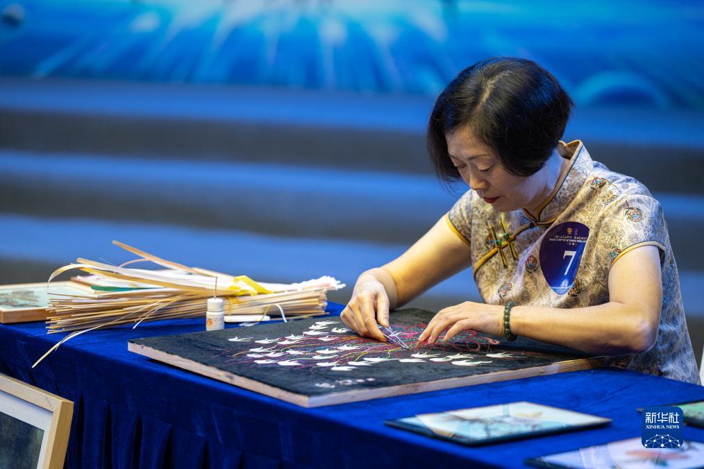 9月21日,選手劉榮萍在現場展示民間美術麥稈畫技藝。