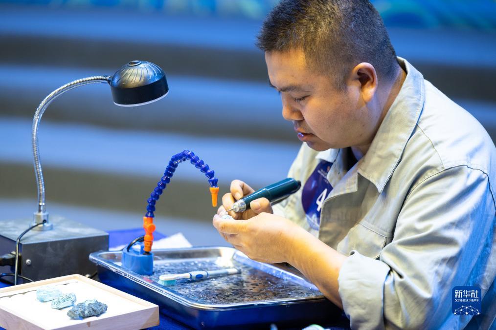 9月21日,選手曹萬里在現場展示綠松石人物挂件雕刻技藝。