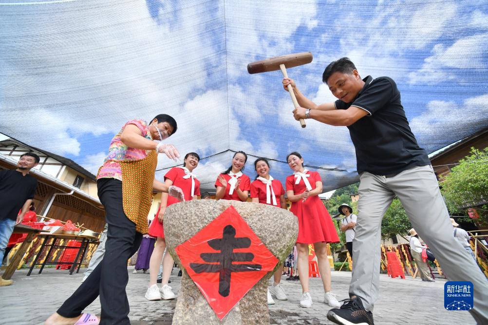 9月23日,游客在桂峰村“曬秋”節上體驗傳統打糍粑。