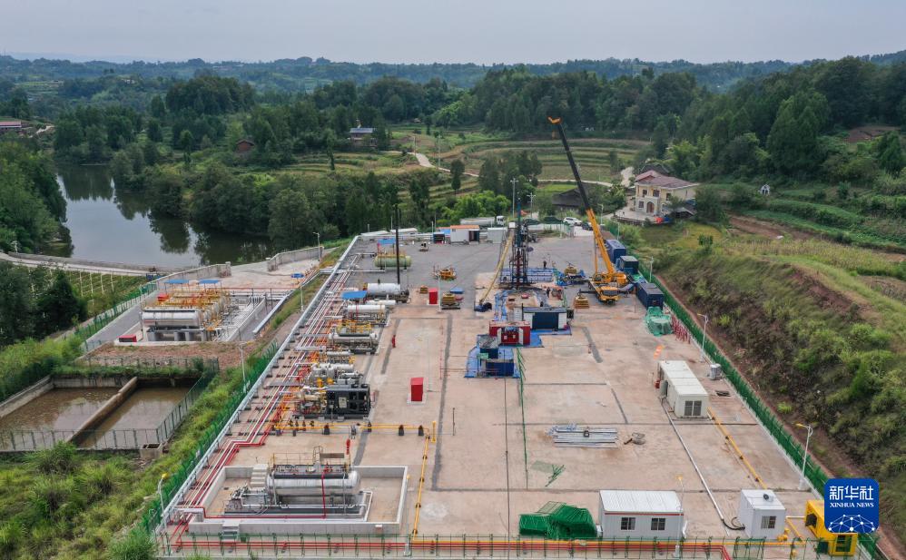 位於重慶忠縣的涪陵頁巖氣田興頁L1001井生産作業現場(9月19日攝,無人機照片)。