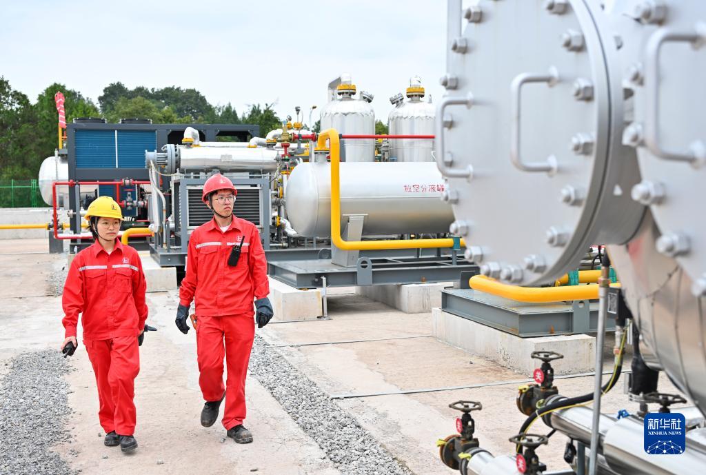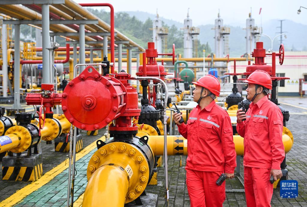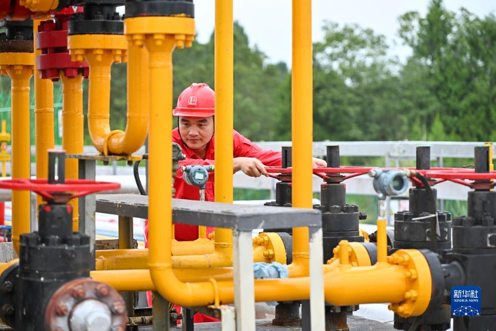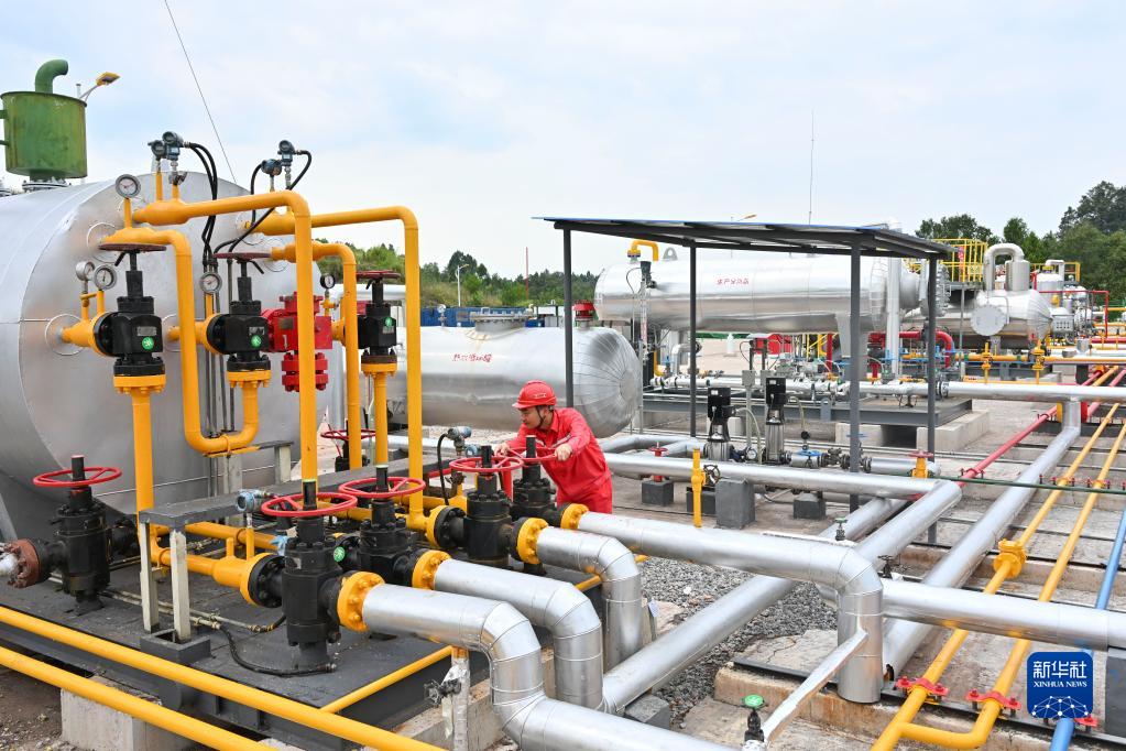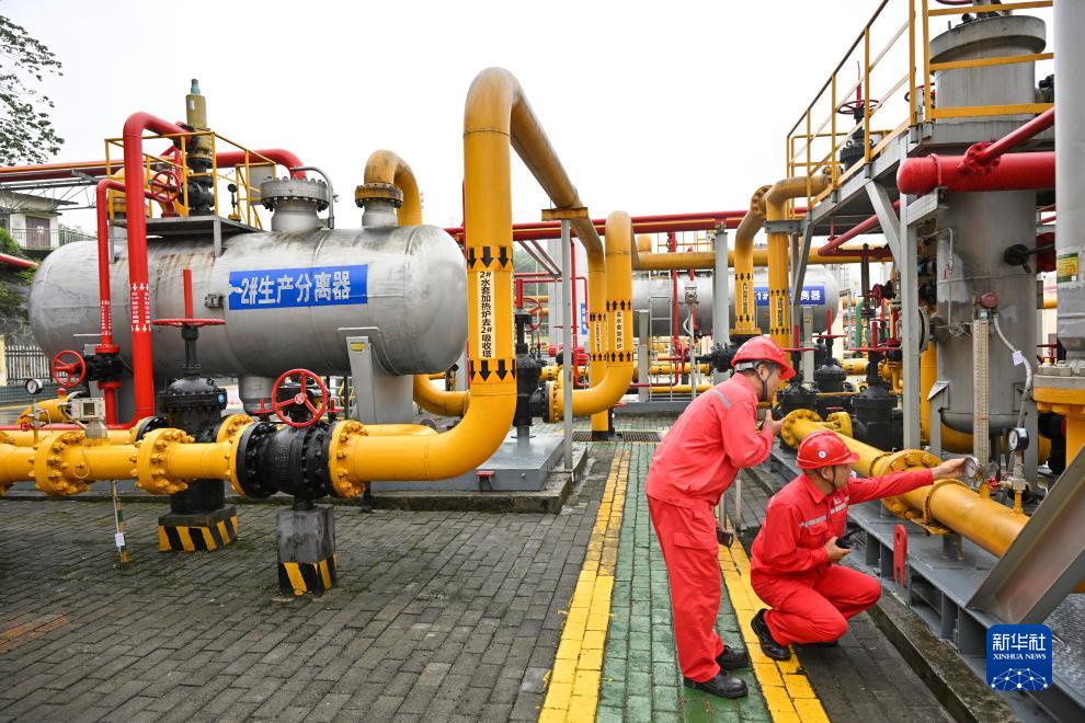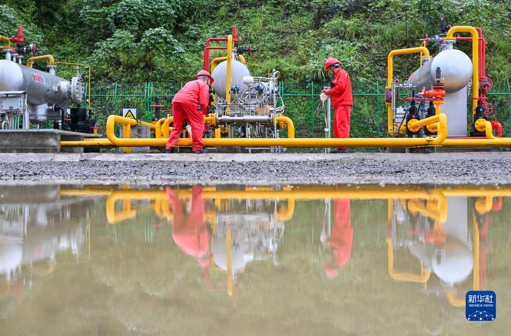 技術人員在位於重慶涪陵的涪陵頁巖氣田白濤集輸站對設備進行巡檢(9月21日攝)。