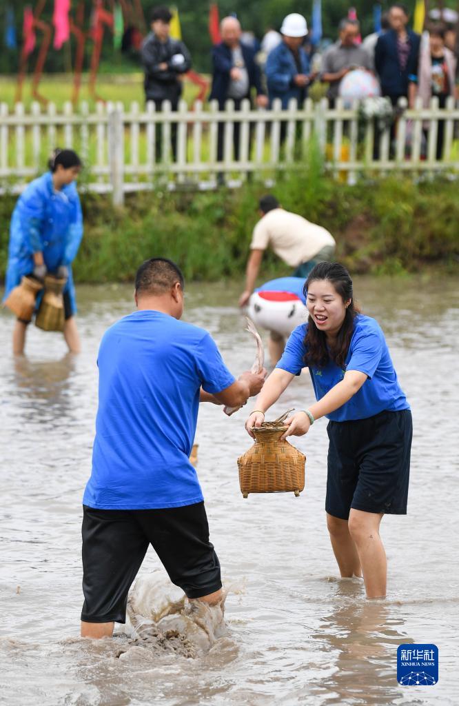 這是9月23日在重慶市璧山區七塘鎮將軍村拍攝的趣味摸魚活動現場。