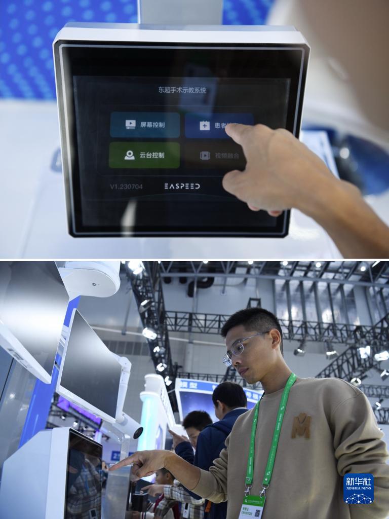 拼版照片:在2023世界製造業大會上,工作人員在演示一款基於“可交互空中成像”技術的非接觸式智慧醫療系統,工作人員無需接觸屏幕,便可直接於空中完成操控(9月23日攝)。