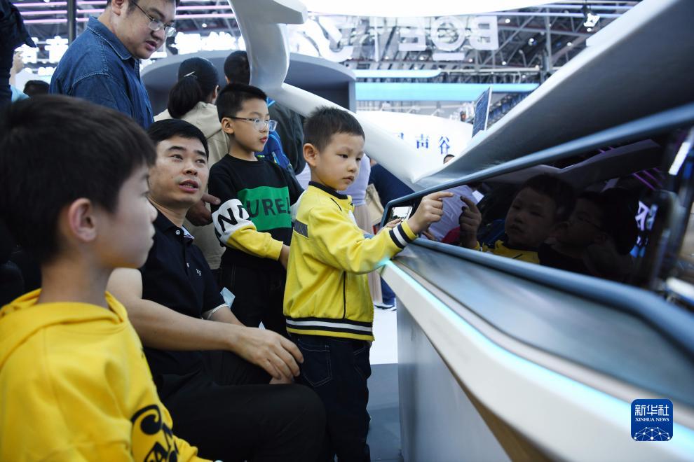 9月23日,在2023世界製造業大會上,小朋友近距離感受智慧車載駕艙。