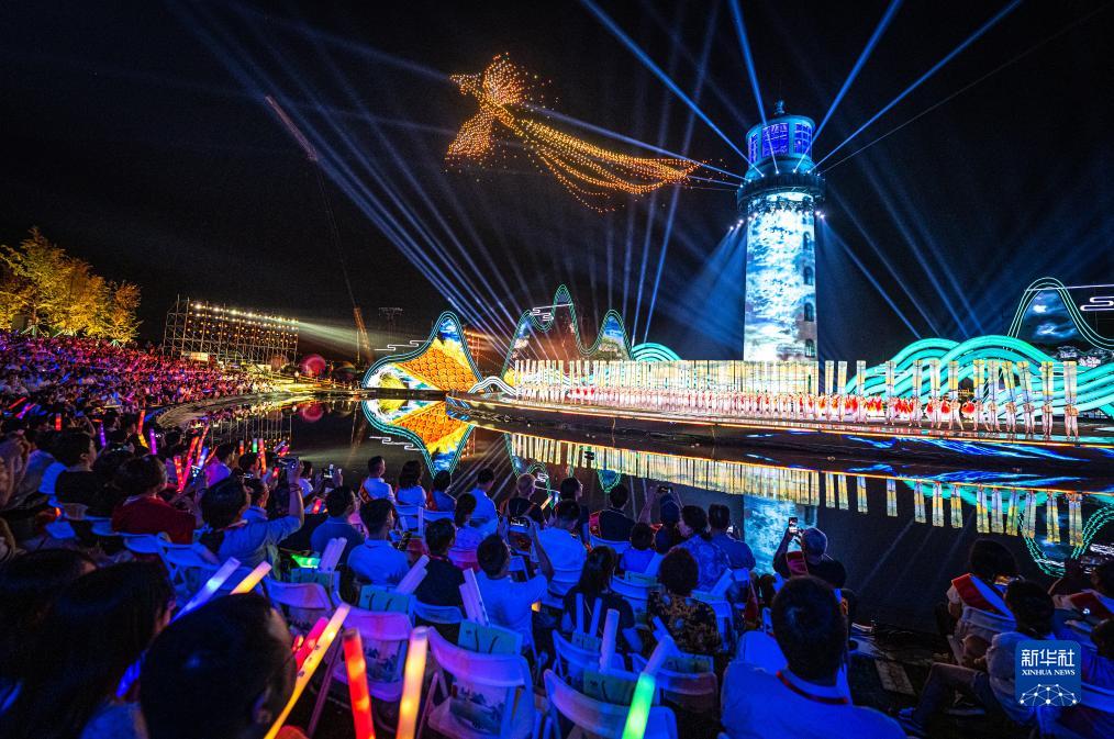9月16日,第十四屆中國長江三峽國際旅游節開幕式在湖北省宜昌市燈塔廣場舉行,觀眾在欣賞開幕式錶演。
