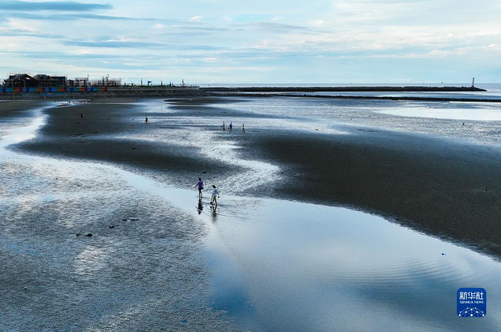 9月16日,游客在江蘇省啟東市“十里海灣”灘塗上游玩(無人機照片)。