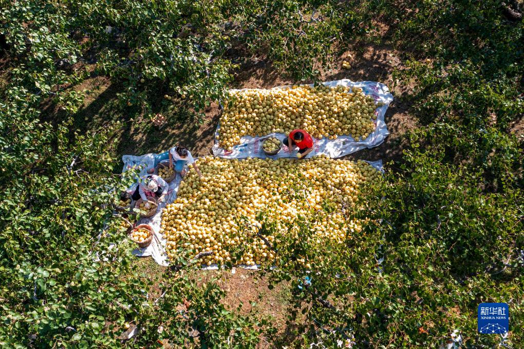 9月20日,安徽省宿州市碭山縣園藝場工人在分揀剛採摘的碭山酥梨(無人機照片)。