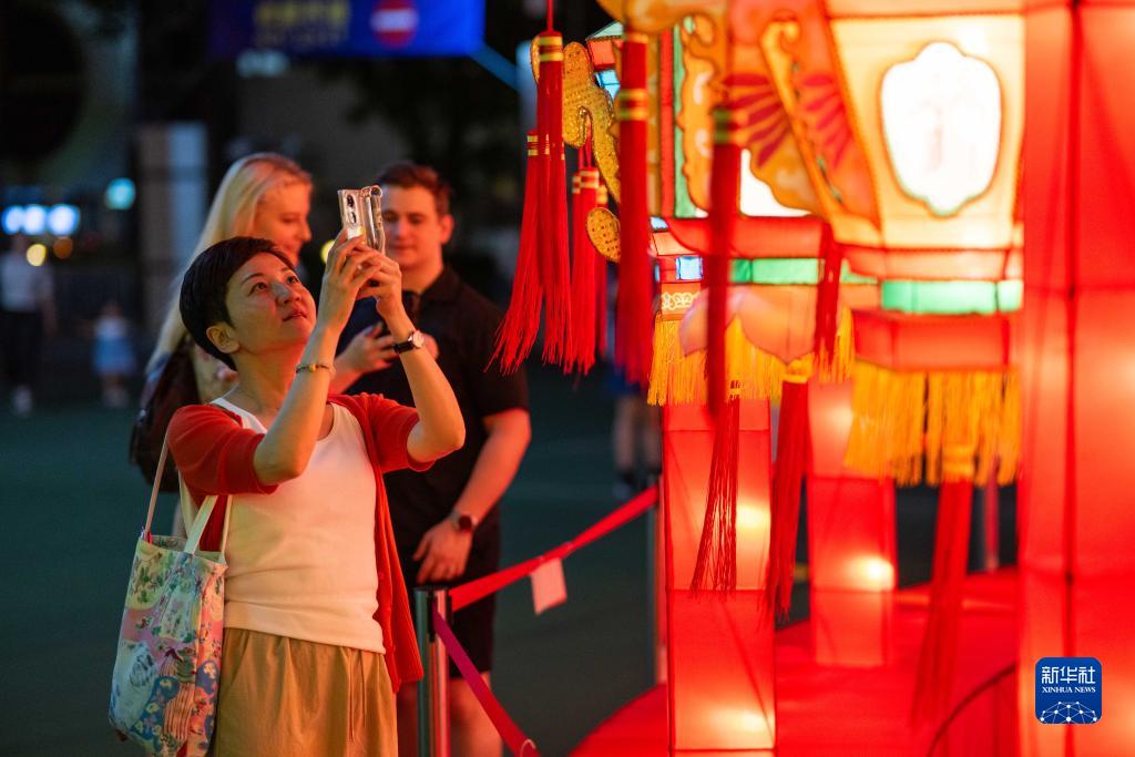 9月23日,一名女士在香港維多利亞公園舉行的中秋綵燈會上拍照。