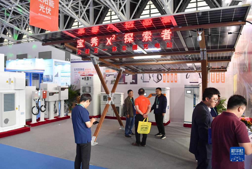 2023歐亞經濟論壇經貿合作博覽會暨中國(陜西)進出口商品展上展出的光儲充一體車棚充電站(9月22日攝)。新華社記者 邵瑞 攝