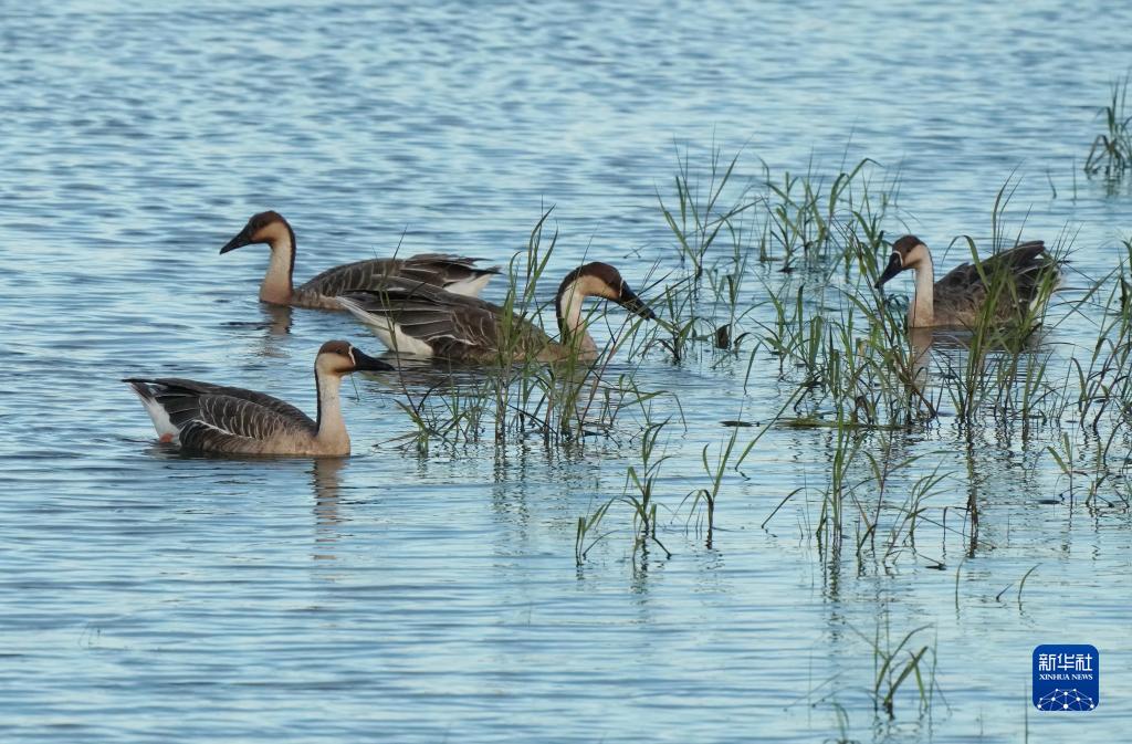 9月23日,四隻鴻雁在河北省秦皇島市北戴河區沿海濕地覓食。