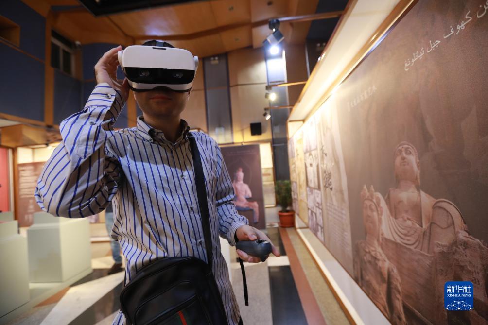 9月23日,一名參觀者在埃及開羅舉行的天龍山石窟數字復原國際巡展上體驗AR佛像數字復原交互技術。