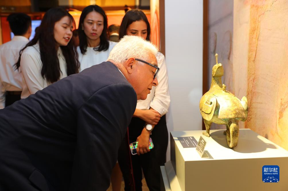 9月23日,一名參觀者在埃及開羅舉行的天龍山石窟數字復原國際巡展上觀看展品。