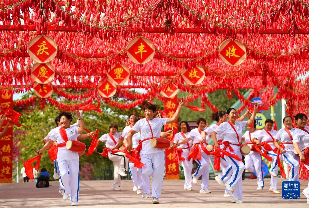 9月23日,遷安市文藝志願者在該市亞灤灣農業公園進行腰鼓表演。