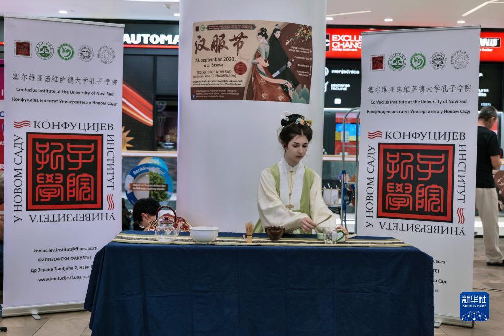 9月23日,在塞爾維亞諾維薩德舉行的“漢服節”活動上,一名學生展示茶藝。
