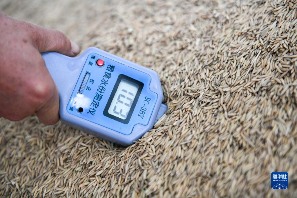 9月24日,在湖南省永州市道縣梅花鎮一家糧食收購企業,工作人員在測定稻穀水份。