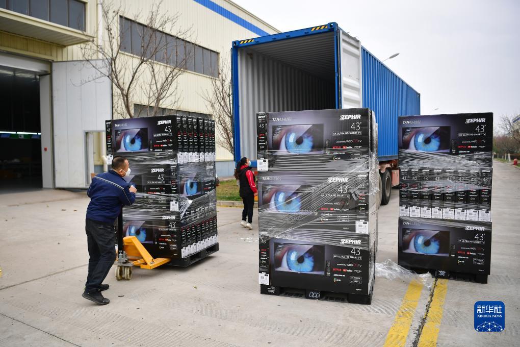 在西安國際港站附近的一家顯示器生産企業內,工人在裝箱産品,準備發貨(2022年3月17日攝)。