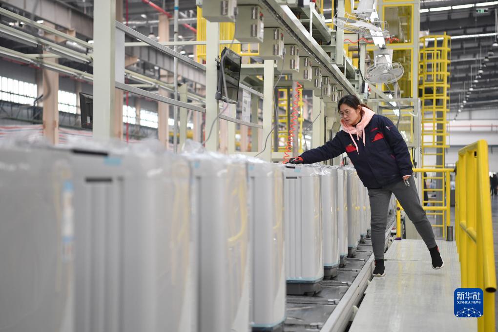 在西安國際港站附近的一家家電生産企業內,工人在生産線上組裝洗衣機(2月22日攝)。