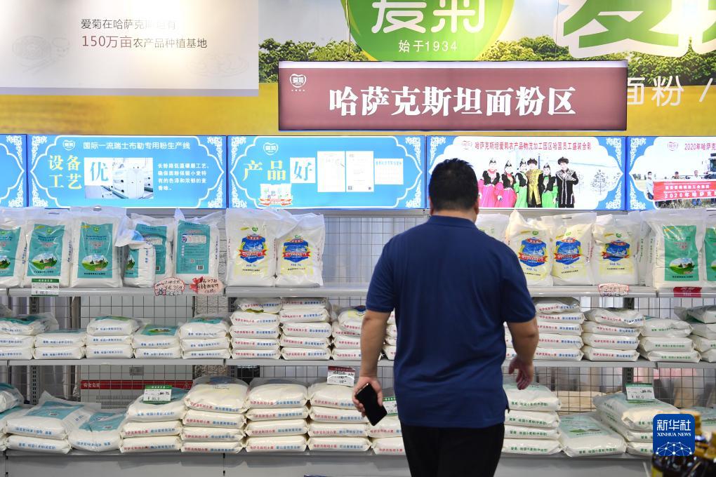 9月22日,在西安國際港站附近一家超市內,顧客選購中歐班列長安號運回的進口麵粉。