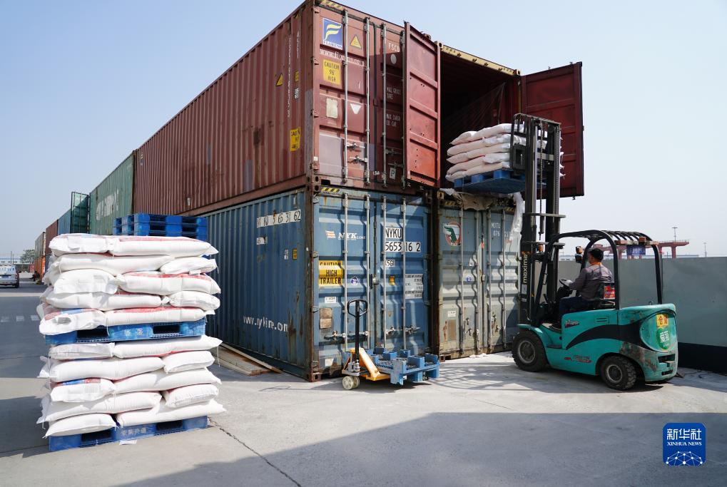在西安國際港站附近的一家農産品物流加工園區內,工人用叉車卸下中歐班列長安號運回的進口麵粉(2020年4月8日攝)。