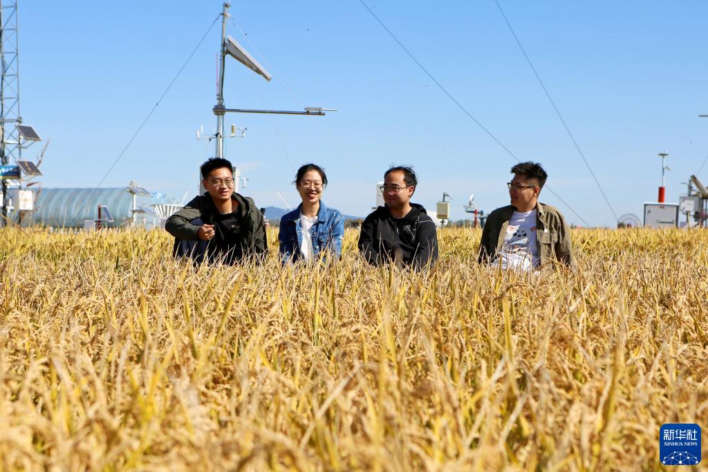 在富錦市現代農業萬畝水稻科技示範園實驗基地,四名青年氣象員在工閒時休息聊天(9月23日攝)。