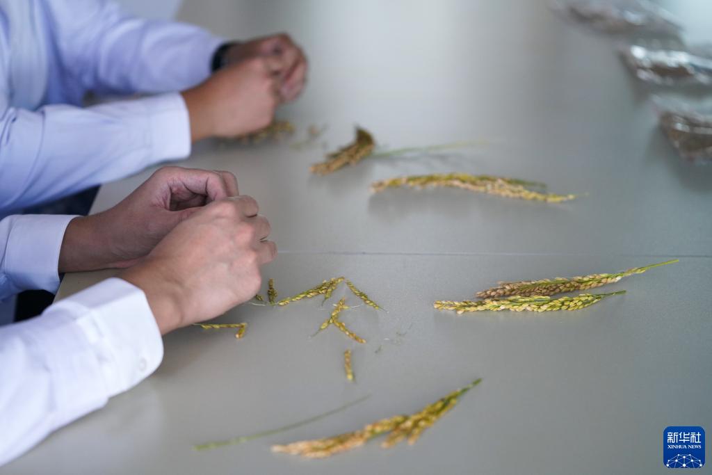 在富錦市現代農業萬畝水稻科技示範園實驗基地,氣象員李辰暉(上)與王國泰在分離稻粒以進行水稻灌漿速率試驗(9月22日攝)。