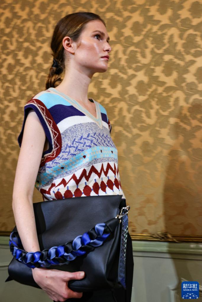 9月23日,模特在意大利米蘭時裝周上展示楚雄彝繡女裝。