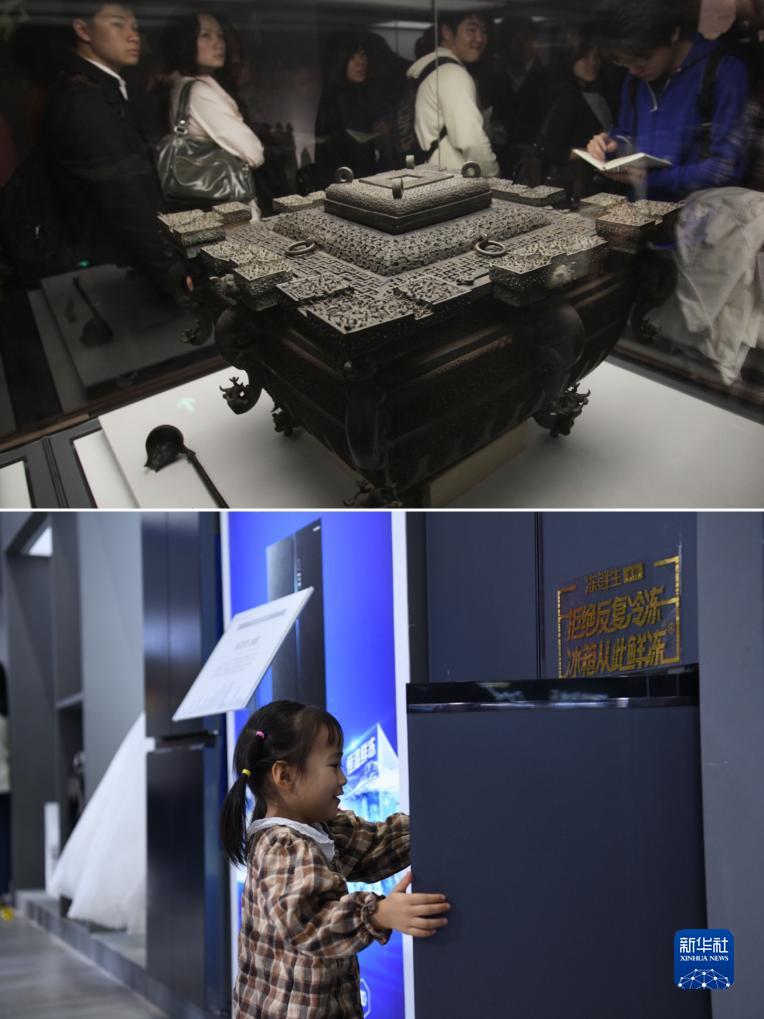 拼版照片:上圖是上海世博會城市足跡館中由國家博物館收藏的戰國曾侯乙銅鑒缶,它被譽為我國最早的冰箱(2010年4月18日攝);下圖為2023世界製造業大會上展出的智能冰箱(9月23日攝)。
