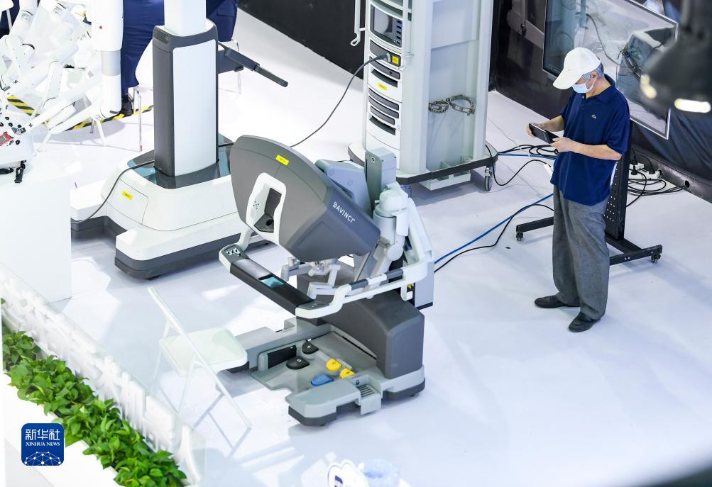 9月23日,一名觀眾在第六屆中國-阿拉伯國家博覽會醫療康養展區觀看拍攝手術機器人。